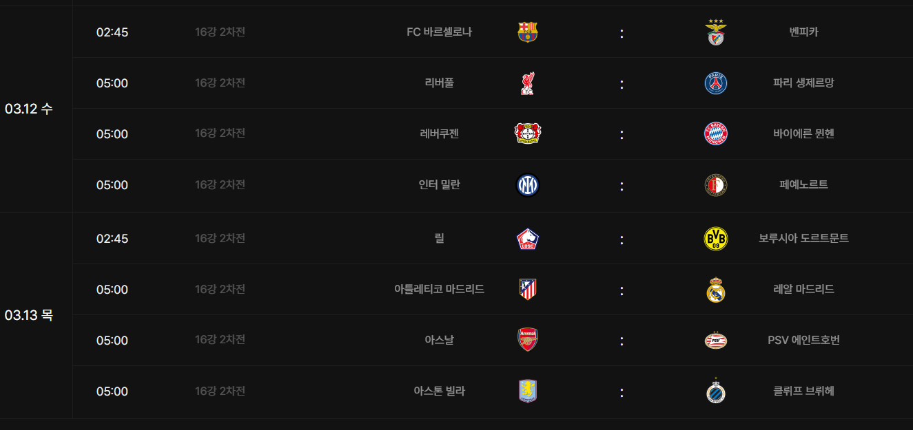 | 4 | PSV 에인트호번 vs 아스널 | 2025년 3월 11일 05:00 | 필립스 스타디온, 에인트호번 |
